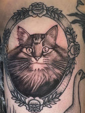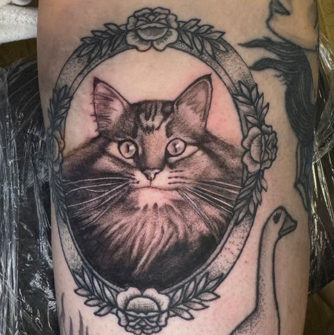 Beyond tattooing, I’m a huge animal lover. I share my life with cats, dogs, and even a snake—and I’m so obsessed with my three-legged cat that I have a tattoo dedicated to her. Animals inspire a lot of my gentleness, patience, and love for detail.